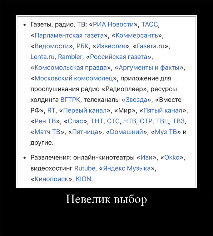 ocr: » Газеты, радио, ТВ: «РИА Новости», ТАСС, «Парламентская газета», «Коммерсантъ», «Ведомости», РБК, «Известия», «Газета.ги», Lenta.ru, Rambler, «Российская газета», «Комсомольская правда», «Аргументы и факты», «Московский комсомолец», приложение для прослушивания радио «Радиоплеер», ресурсы холдинга ВГТРК, телеканалы «Звезда», «Вместе- РФ», ВТ, «Первый канал», «Мир», «Пятый канал», «Рен ТВ», «Спас», ТНТ, CTC, НТВ, ОТР, ТВЦ, TB3, «Матч ТВ», «Пятница», «Бомашний», «Муз ТВ» и другие. » Развлечения: онлайн-кинотеатры «Иви», «ОККо», видеохостинг Rutube, «Яндекс Музыка», «Кинопоиск», КОМ.