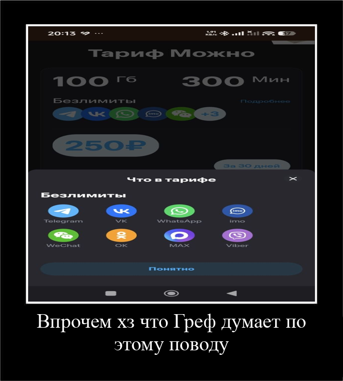 визуальные теги: телефон. OCR: 20:13 % -- coe Ball Ni E Что B тарифе x Безлимиты ЖЖ. Telegram VK WhatsApp im ®@o0o ® WeChat OK MAX Viber Понятно s © 4. выбран текст: Впрочем хз что Греф думает по этому поводу