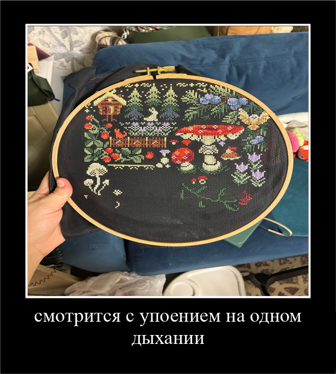визуальные теги: a hand embroidered embroidery pattern on a blue bag. выбран текст: смотрится с упоением на одном дыхании