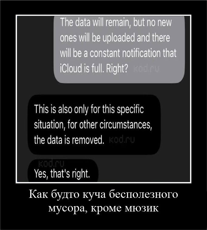 визуальные теги: a text message that reads, ` ` ' ' the data will be replaced and the text will be replaced. OCR: This is also only for this specific situation, for other circumstances, the data is removed. Yes, that's right.. выбран текст: Как будто куча бесполезного мусора, кроме мюзик