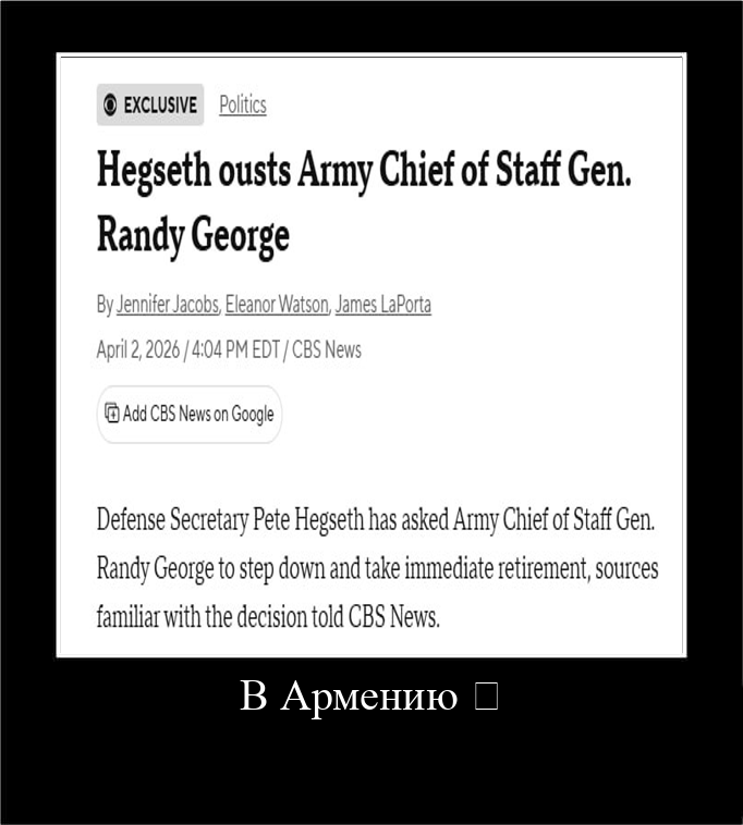 визуальные теги: the article is about the dangers of the new york fire. OCR: @ EXCLUSIVE Politics Hegseth ousts Army Chief of Staff Gen. Randy George By Jennifer Jacobs, Eleanor Watson, James LaPorta April 2, 2026 / 4. выбран текст: В Армению 🌚