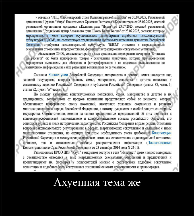 ocr: - ответами "РПЦ Миссионерский отдел Калининградской Епархии" от 30.07.2025, Религиозной организации Церковь "Мира" Евангельских Христиан Баптистов г.Калининграда от 25.07.2025, местной религиозной организации мусульман г.Калининграда "Ихсан" от 23.07.2025, местной религиозной организации "Буддийский центр Алмазного пути Школы Карма Кагью" от 23.07.2025, согласно которым мероприятие, ‘в ходе которого осуществлялась демонстрация атрибутики психосексуальной субкультуры "БДСМ", не соответствует традиционным духовно-нравственным ценностям Российской Федерации, атрибутика психосексуальной субкультуры "БДСМ" относится к нетрадиционным сексуальным отношениям и предпочтениям, формирует нетрадиционные сексуальные установки; - объяснением ФИО9, согласно которому в ходе организации мероприятия вечеринки "От заката до’ рассвета" ею были приобретены товары - сексуальная атрибутика, которые при проведении мероприятия выставлены для обозрения и фотографирования и не подлежали использованию по назначению, информация на сайте размещена волонтерами по ее указанию; Согласно Конституции Российской Федерации материнство и детство, семья находятся под защитой государства; вопросы защиты семьи, материнства, отцовства” и детства относятся к совместному ведению Российской Федерации и субъектов Российской Федерации (статья 38, часть 1; статья 72, пункт "ж" части 1). По смыслу названных конституционных положений, семья, материнство и детство в их традиционном, воспринятом от предков понимании представляют собой те ценности, которые обеспечивают непрерывную смену поколений, выступают условием сохранения и развития многонационального народа Российской Федерации, а потому нуждаются в особой защите со стороны государства. Соответственно, именно на основе традиционных представлений об этих ценностях в контексте особенностей национального и конфессионального состава российского общества, его социокультурных и иных исторических характеристик Российская Федерация вправе решать отдельные вопросы законодательного регулирования в.сферах, затрагивающих сексуальные и связанные с ними межличностные отношения, не отрицая при этом необходимость учета требований Конституции Российской Федерации и международно-правовых актов как относительно индивидуальной автономии личности, так и относительно’ свободы распространения информации (Постановление Конституционного Суда Российской Федерации от 23 сентября 2014 года М 24-П). Размещенные КРОО ЦИР "Кауп" в открытом доступе в сети "Интернет" фото и видео материалы с очевидностью относятся .K теме нетрадиционных сексуальных ^отношений и предпочтений и пропагандируют их, формируя y пользователей мнение о соответствии подобной сексуальной ориентации и подобных форм сексуальных отношений основам нравственности и правопорядка.