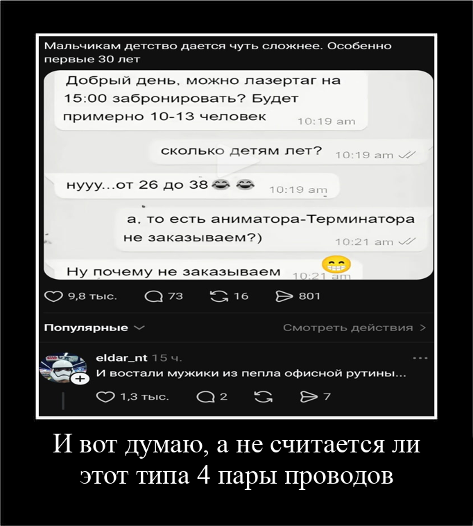 ocr: Мальчикам детство дается чуть сложнее. Особенно первые 30 лет Добрый день, можно лазертаг на 15:00 забронировать? Будет примерно 10-13 человек сколько детям лет? нууу...от 26 до 38 <> < а, то есть аниматора-Терминатора не заказываем?) Ну почему не заказываем С 9,8 тыс. Q73 16 Популярные ~ од» eldar_nt 26 И востали мужики из пепла офисной рутины... ©О13ть. С 2 DQ B7