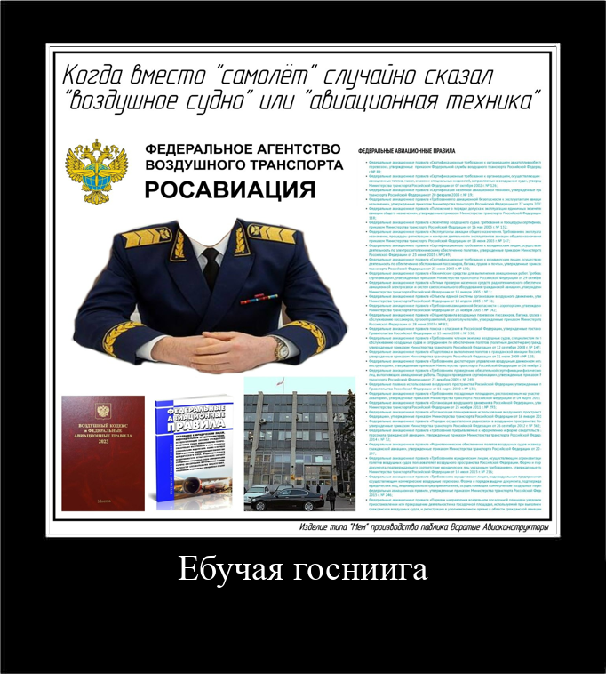 ocr: Kozda вместо ‘самолет“ случаино сказал Воздушное субно” или ‘авиационная техника ФЕД Е РАЛ b H Oo E A ГЕ HTCTBO ФЕДЕРАЛЬНЫЕ АВИАЦИОННЫЕ ПРАВИЛА. ВОЗДУШНОГО ТРАНСПОРТА РОСАВИАЦИЯ Изделие muna “Mem” производство паблика Всратые Авиаконструкторы