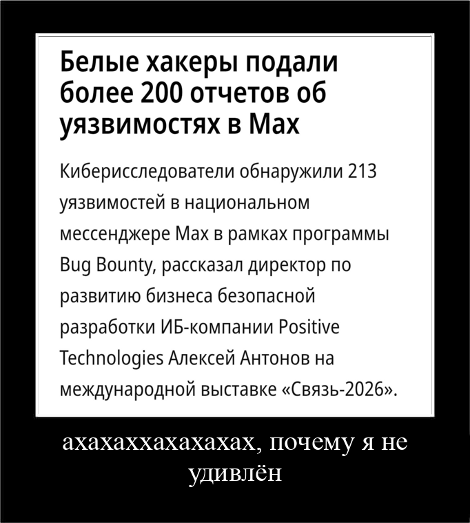ocr: Белые хакеры подали более 200 отчетов об уязвимостях в Мах Киберисследователи обнаружили 213 уязвимостей в национальном мессенджере Мах в рамках программы Bug Bounty, рассказал директор по развитию бизнеса безопасной разработки ИБ-компании Positive Technologies Алексей Антонов на международной выставке «Связь-2026».