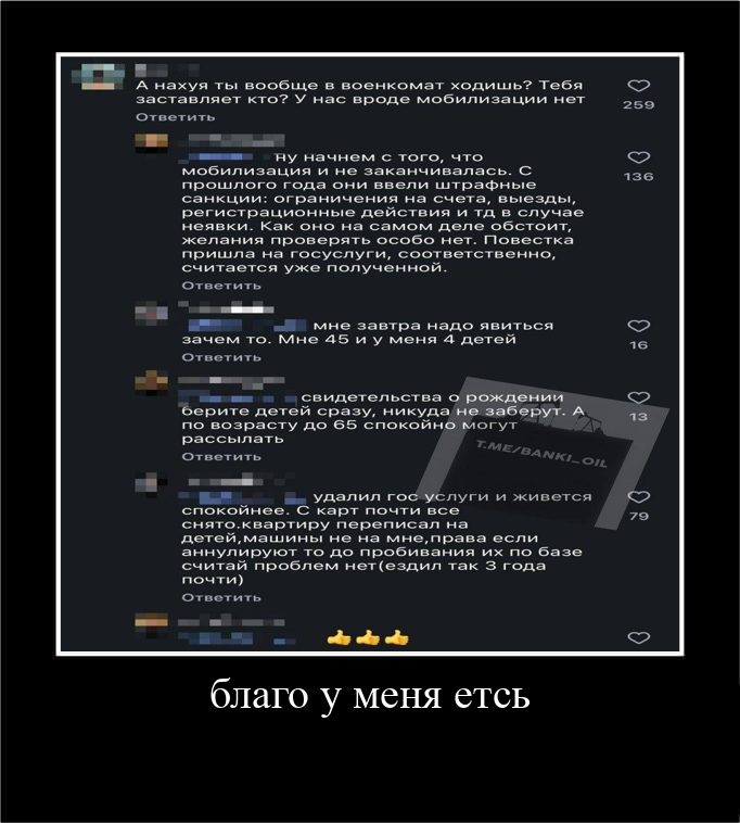 ocr: вии А нахуя ты вообще в военкомат ходишь? Тебя заставляет кто? У нас вроде мобилизации нет Ответить и вии” Ay начнем с того, что мобилизация и не заканчивалась. С прошлого года они ввели штрафные санкции: ограничения на счета, выезды, регистрационные действия и тд в случае неявки. Как оно на самом деле обстоит, желания проверять особо нет. Повестка пришла на госуслуги, соответственно, считается уже полученной. Ответить = = =" мне завтра надо явиться зачем то. Мне 45 иу меня 4 детей Ответить = = = свидетельства о рождении берите детей сразу, Hukyfa He заберут. А по возрасту до 65 спокойно могут рассылать Ответить i] Lt & удалил гос услуги и живется спокойнее. С карт почти все снято.квартиру переписал на детей, машины не на мне, права если аннулируют то до пробивания их по базе считай проблем нет(ездил так 3 года почти) Ответить р = 4% 259 136 13 © 79